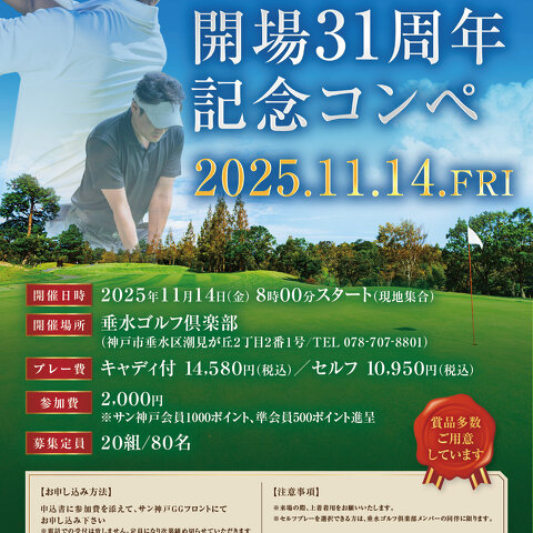 サン神戸ゴルフガーデン 開場31周年記念コンペ 開催のお知らせ 開催日時 2025年11月14日(金) 8時00分スタート(現地集合) 開催場所 垂水ゴルフ倶楽部 プレー費 キャディ付 14,580円(税込)/セ...
