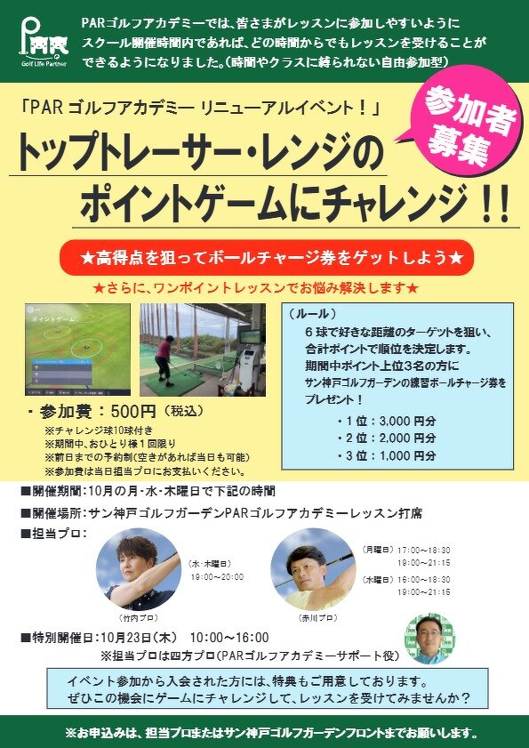 PARゴルフアカデミー主催のポイントゲームチャレンジ トップトレーサー・レンジのポイントゲームにチャレンジ 開催期間 10月の月・水・木曜日のPERゴルフアカデミーのレッスン時間 開催場所 レッスン打席(サン神戸ゴルフガーデン) 参加費 500円(税込)参加費は当日担当プロにお渡しください 申込方法 担当プロ又はサン神戸ゴルフガーデンのフロントまで 詳しくはチラシをご参照ください ご参加、お待ち申し上げております。