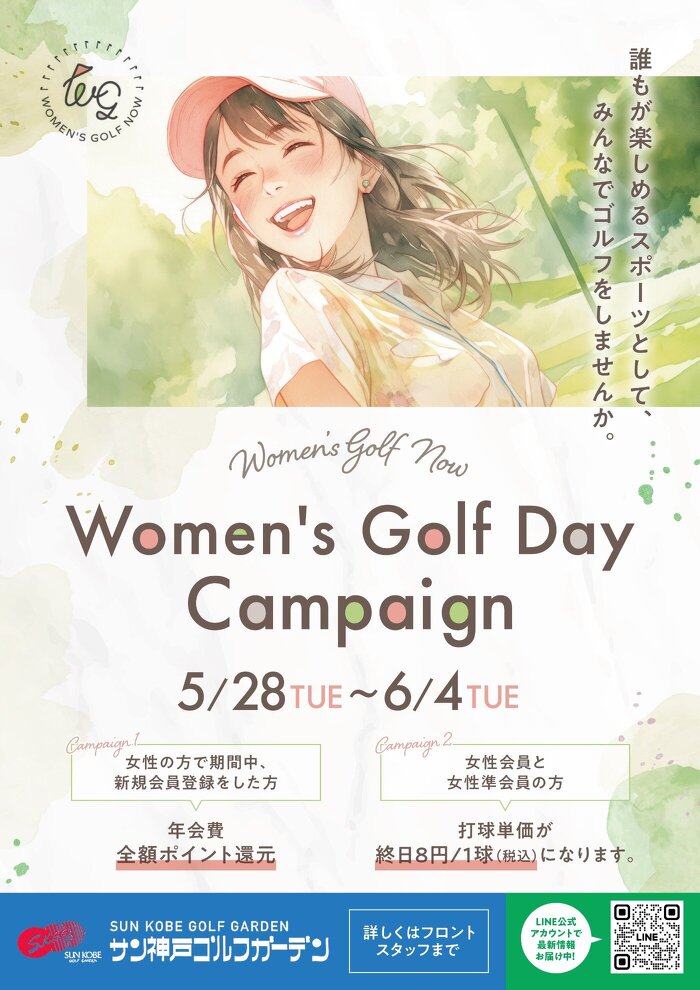 女性ゴルファーの日協賛イベントを実施します。 実施期間:2024年5月28日(火)~6月4日(火) 実施内容:①期間中女性新規会員登録は年会費全額ポイント還元 ②女性会員・準会員の打球単価を8円/1球(税込)※土日を含む全営業時間 女性の方はこの機会に会員登録をお願い致します。