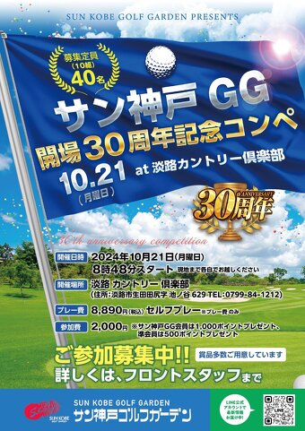 開場30周年記念コンペを開催いたしますので、ぜひご参加ください。 【お申し込み方法】 ・フロントに参加費をお支払いいただきます。 ・ご参加者名も必要です。 ※電話での予約は受付致しかねますので、予めご了承願います。 詳細はフロントにお問い合わせください。