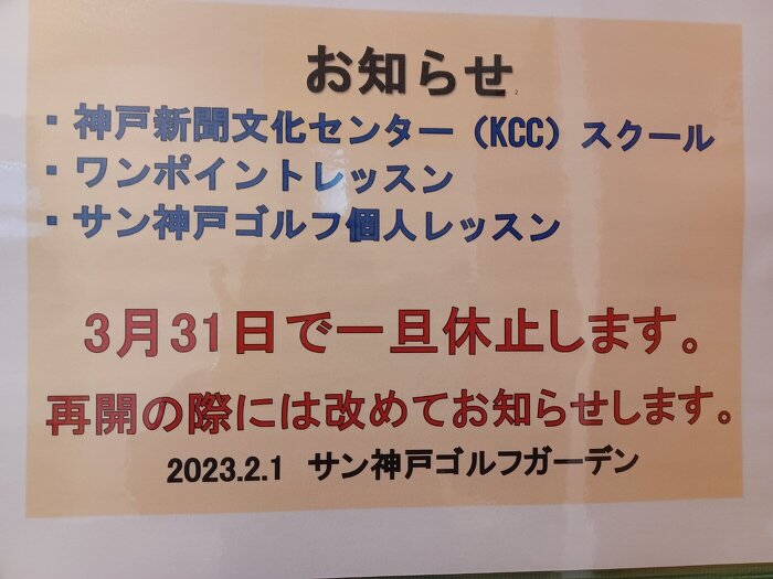 一松唯晴氏の 神戸新聞文化センター(KCC)スクール ワンポイントレッスン サン神戸ゴルフ個人レッスン は2023年3月31日で一旦休止します。 長い間、ご利用頂きありがとうございました。 再開の際には改めてお知らせします。