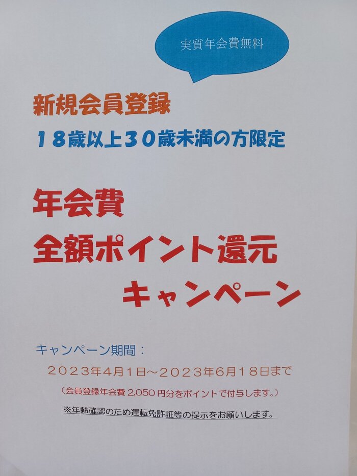 今年も18歳以上30歳未満の方を限定に新規会員登録の年会費2050円を全額ポイントで還元するキャンペーンを4月1日から6月18日の間実施します。会員登録するとフロント営業時間での1球あたりの貸ボール料金が安く、誕生日月にご利用されるとポイントが付加されるなどの特典があります。是非この期間に会員登録して下さい。