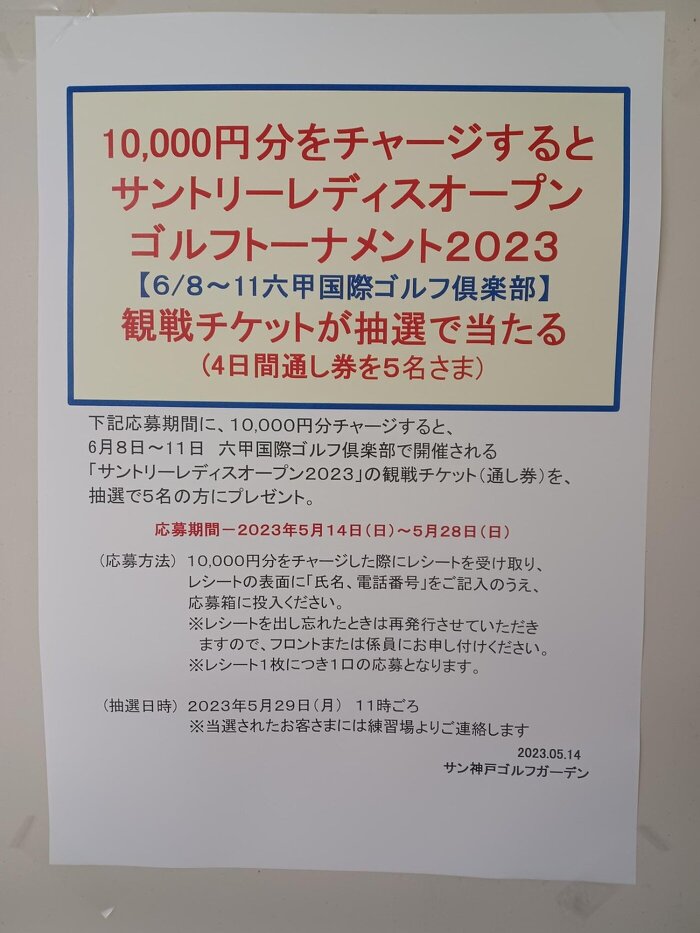 サン神戸ゴルフガーデンのICカードに応募期間中10,000円チャージして頂いた方に抽選で5名の方に「サントリーレディスオープンゴルフトーナメント2023」観戦チケット通し券をプレゼントします。 応募期間は2023年5月14日(日)から2023年5月28日(日)まで、抽選日は2023年5月29日(月)11時ごろ。当選された方には当練習場から連絡致します。詳細はフロンまで。