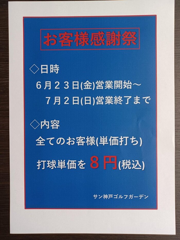 サン神戸ゴルフガーデンは6月23日(金)から7月2日(日)までお客様感謝祭を実施します。 期間中はすべてのお客様の打球単価を終日8円/1球(税込)とします。ぜひこの機会にご来場ください。