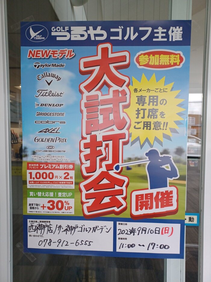 2023年9月10日(日)11:00から17:00までつるやゴルフ主催の大試打会が開催されます。