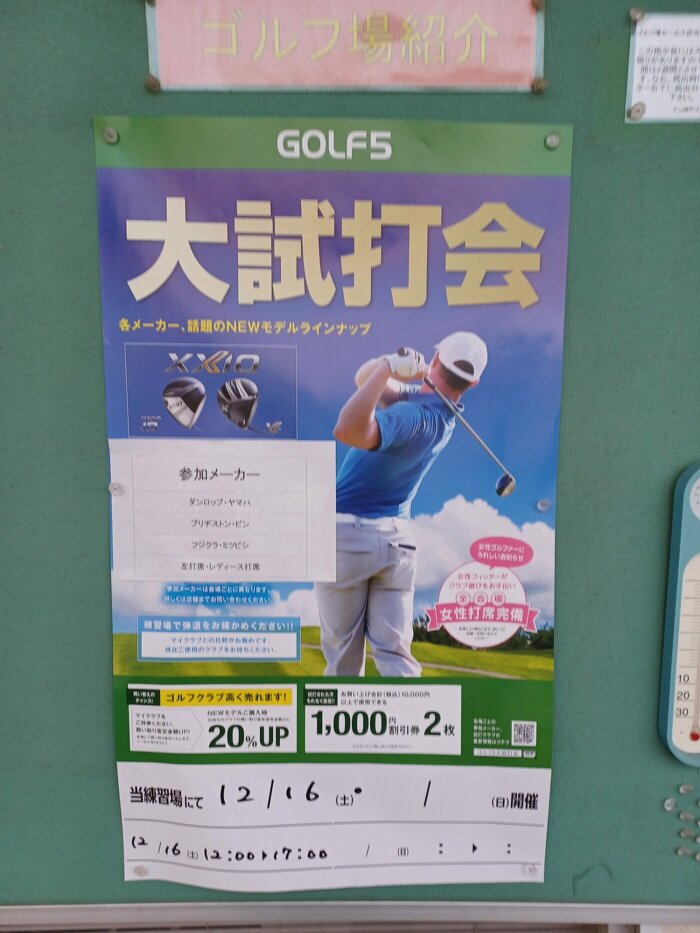 ゴルフ5主催の大試打会が12月16日(土)12:00~17:00まで開催されます。 参加メーカーはダンロップ、ヤマハ、ブリヂストン、ピン、フジクラ、ミツビシです。 ご来場お待ちしております。