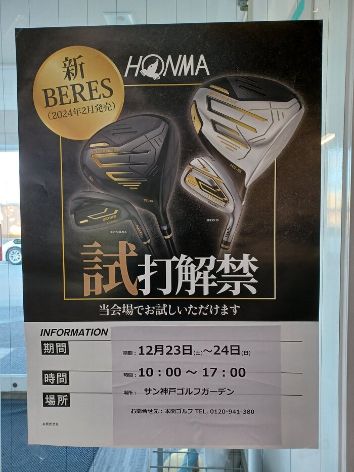 本間ゴルフ主催の試打会を12月23日(土)24日(日)の両日10:00~17:00まで1打席のみで開催致します。 2024年2月発売予定の「新BERES]をサン神戸ゴルフガーデンでお試しください。