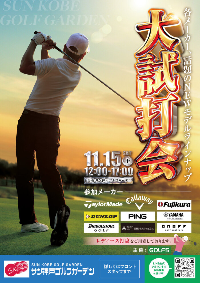 ゴルフ5主催 「大試打会」のご案内 11月15日(土)12:00~17:00 サン神戸ゴルフガーデン 1階 打席№1~12 各メーカー話題のNEWモデルラインナップ お気軽にご参加ください